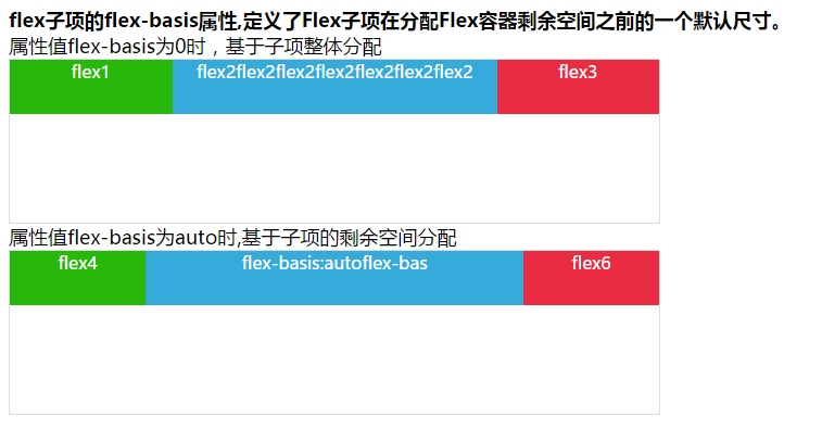 - flex-basis:子项在分配容器剩余空间之前的一个依据基础,如果设置为0,内容不考虑子项内容周围额外空间,如果设置为auto,子项的额外空间基于flex-grow分布。