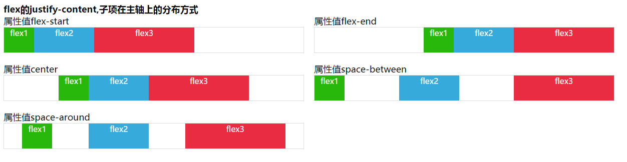 justify-content: flex-start | flex-end | center | space-between | space-around;