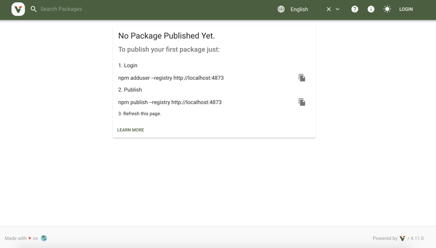 默认 Verdaccio 启动的服务都会在 4873 这个端口,在浏览器中打开这个地址我们就会看到 Verdaccio 搭建的私有库 npm 的界面