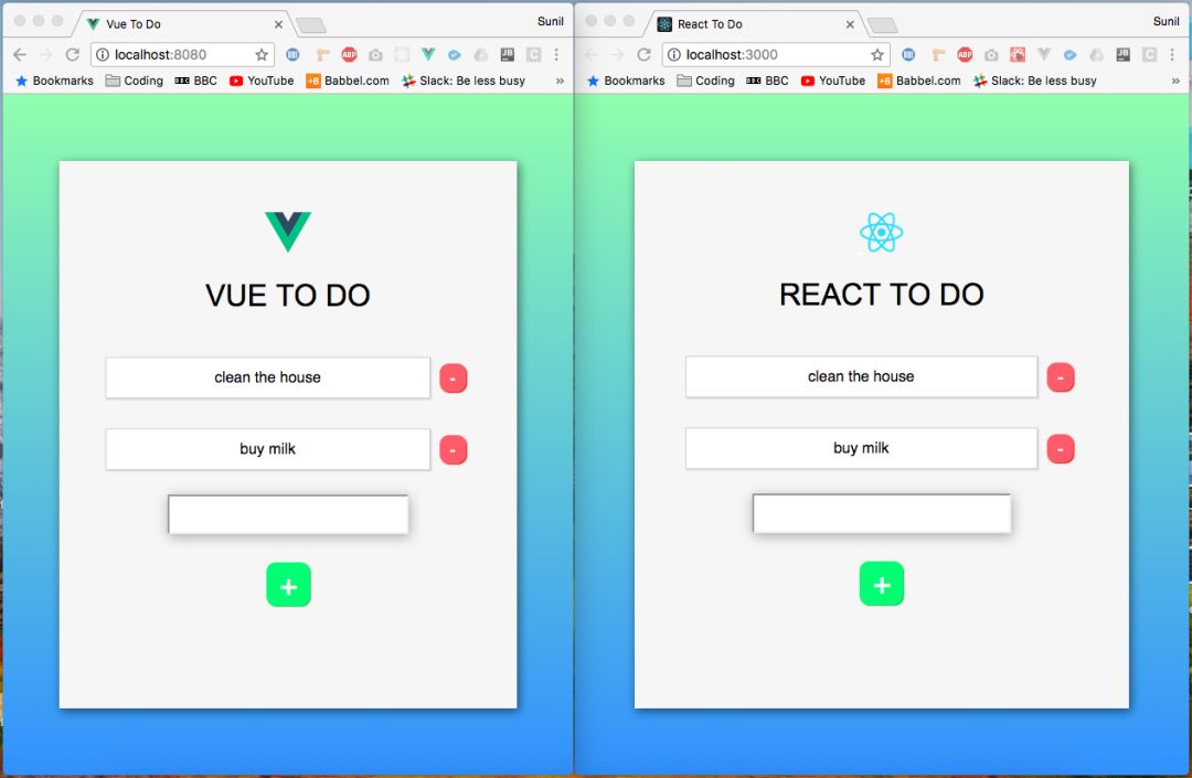 我将会构建一个标准的待办事项应用程序,允许用户添加和删除列表中的项目。这两个应用程序都使用默认的 CLI(command-line interface,命令行界面) 构建,React 使用 create-react-app,Vue 使用 vue-cli。