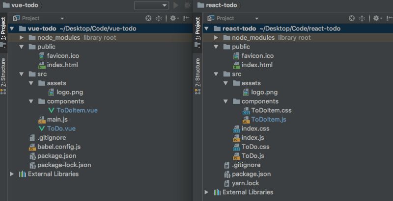 你会发现它们的结构几乎完全相同。唯一的区别在于 React App 拥有三个 CSS 文件,而 Vue App 中没有 CSS 文件。这是因为 React 的 create-react-app 组件需要一个附带文件来保存其样式,而 Vue CLI 采用全包方法,其样式在实际组件文件中声明。