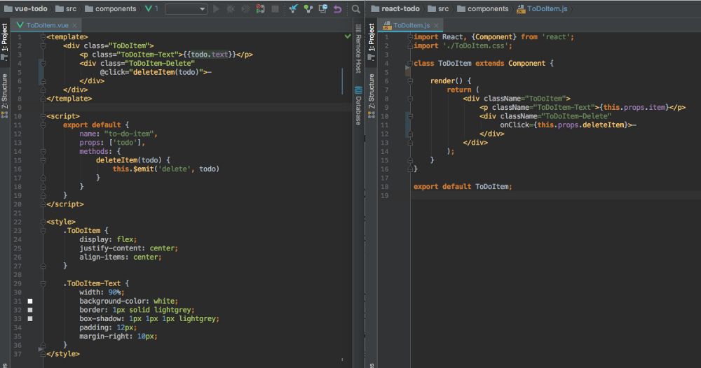 此处我们向 ToDoItem 组件传递了两个 prop。之后,我们可以在子组件中通过 this.props 引用它们。因此,想要访问 item.todo prop,我们只需调用this.props.item 。 Vue 的实现方法 在 Vue 中,我们将 props 传递到子组件创建处的方式如下: